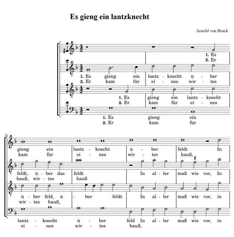 Arnold von Bruck (c1500 - 6 febbraio 1554): Es gieng ein lantzknecht a 4 voci (pubblicato in Der ander theil Kurtzweiliger guter frischer Teutscher Liedlein zu singen vast lustig, 1540, n. 47). Convivium Musicum e Ensemble Villanella.