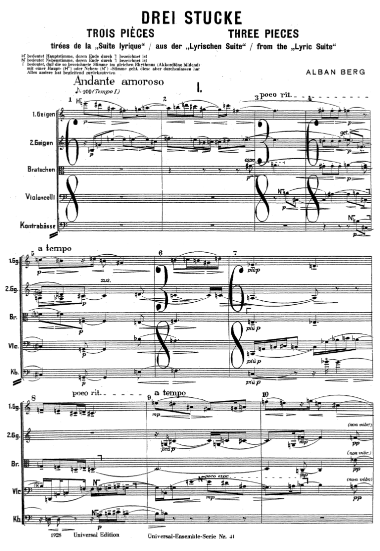 La Lyrische Suite risale agli anni 1925-26, è per quartetto d’archi ed è suddivisa in 6 movimenti; di questi, Berg ha adattato per orchestra il II, il III e il IV.