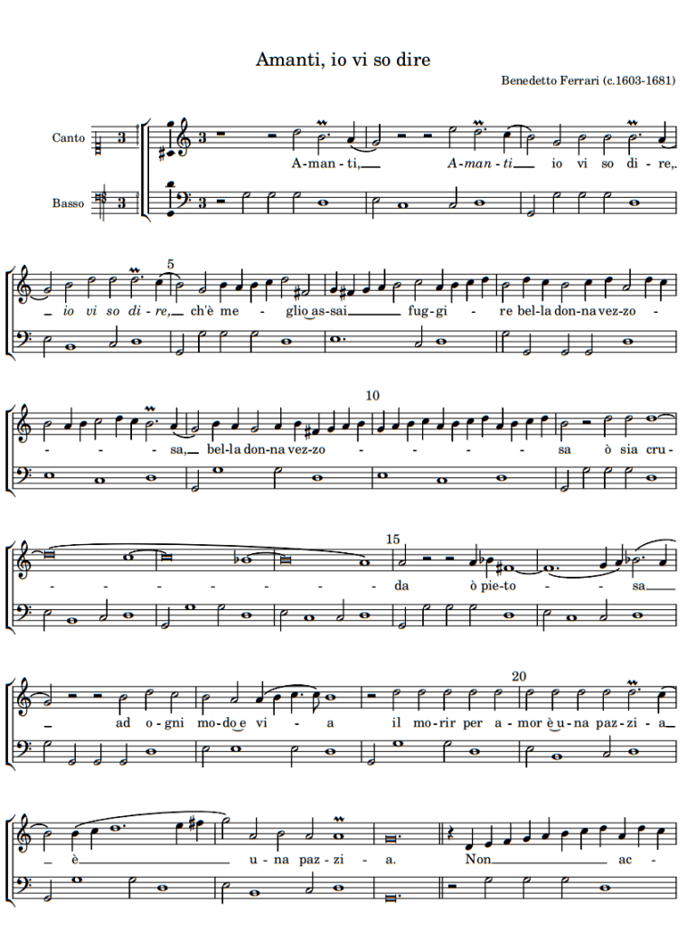 Benedetto Ferrari (1597 - 22 ottobre 1681): Amanti, io vi so dire, aria per voce e basso continuo (pubblicata in Musiche e poesie varie à voce solo, Libro Terzo, 1641). Peggy Bélanger, soprano; Michel Angers, chitarrone.