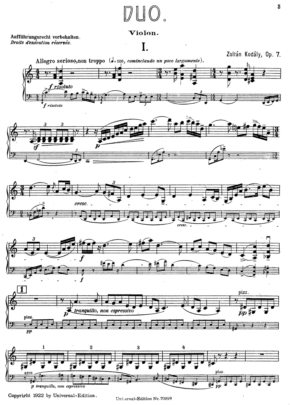 Kodály sviluppa l’intero pezzo in forma di dialogo tra i due strumenti, i quali sono in conversazione continua, non sempre amichevole. Ciò, probabilmente, ha a che fare con la formazione linguistica del compositore.