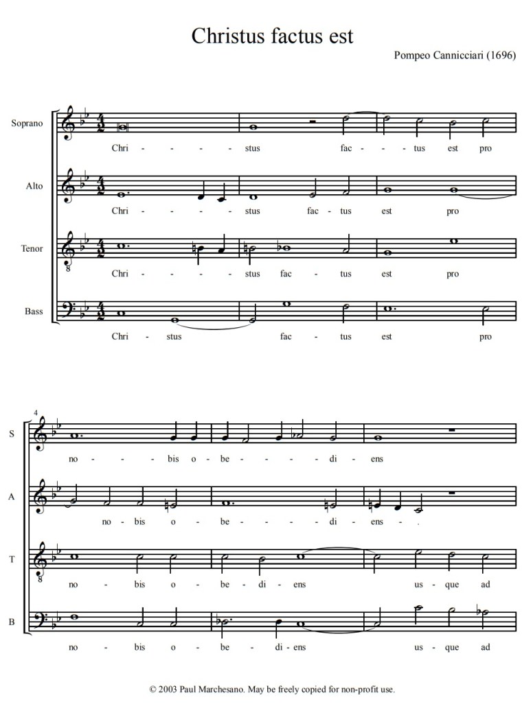 Bellissimo canone alla 5a inferiore (do – fa), non sfugge la sua linearità all’orecchio né all’occhio che segue la partitura: do – do-re-dolasib-la canta il soprano, fa – fa-sol-faremib-re risponde il contralto a distanza di una battuta, poi all’ottava-nona battuta il gioco è ripreso da tenore e basso, che però attaccano metà misura dopo.