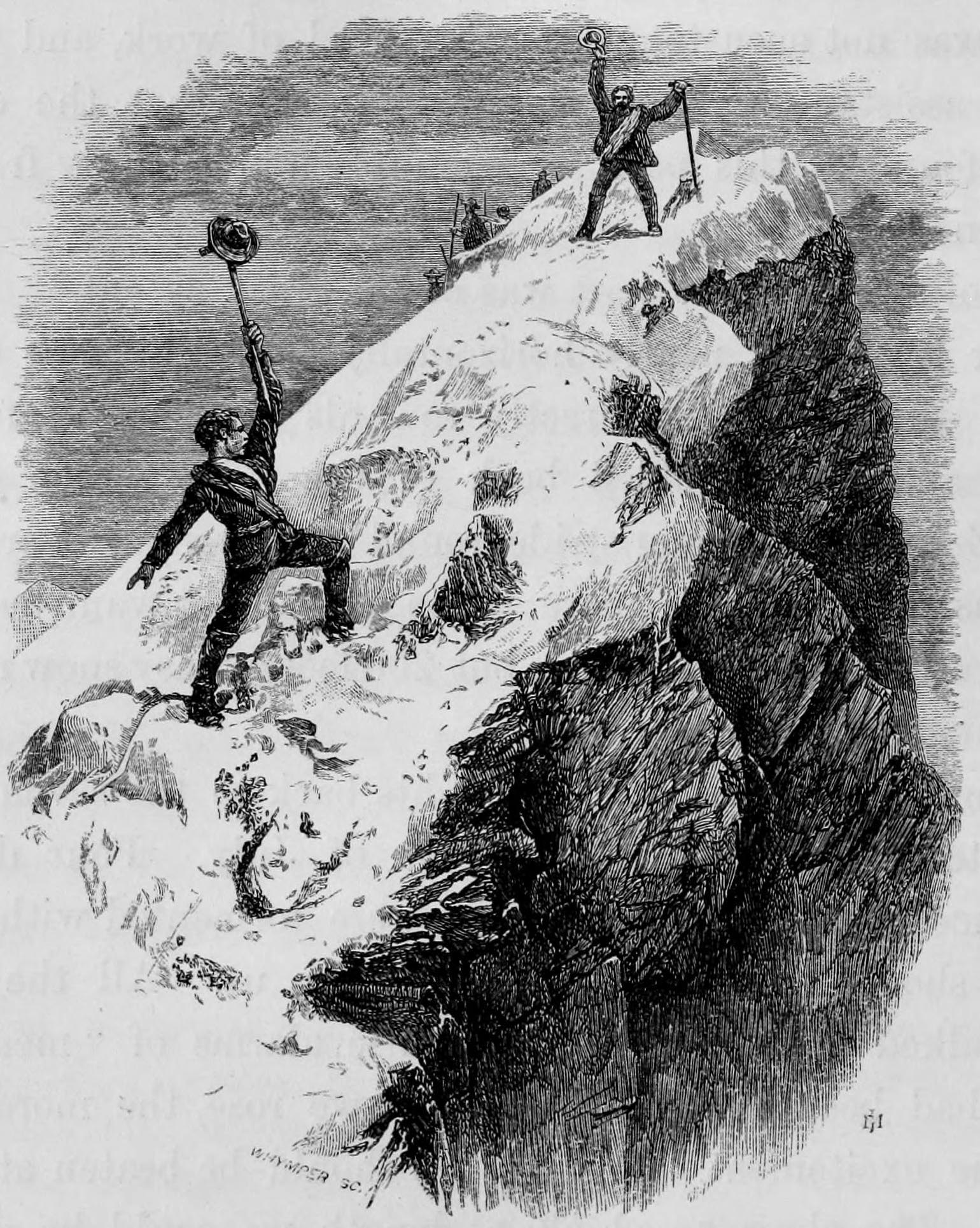 L’inclinazione del pendio è diminuita tanto che Whymper e Croz si slegano e si lanciano in una corsa folle, fianco a fianco, giungendo sulla vetta insieme: