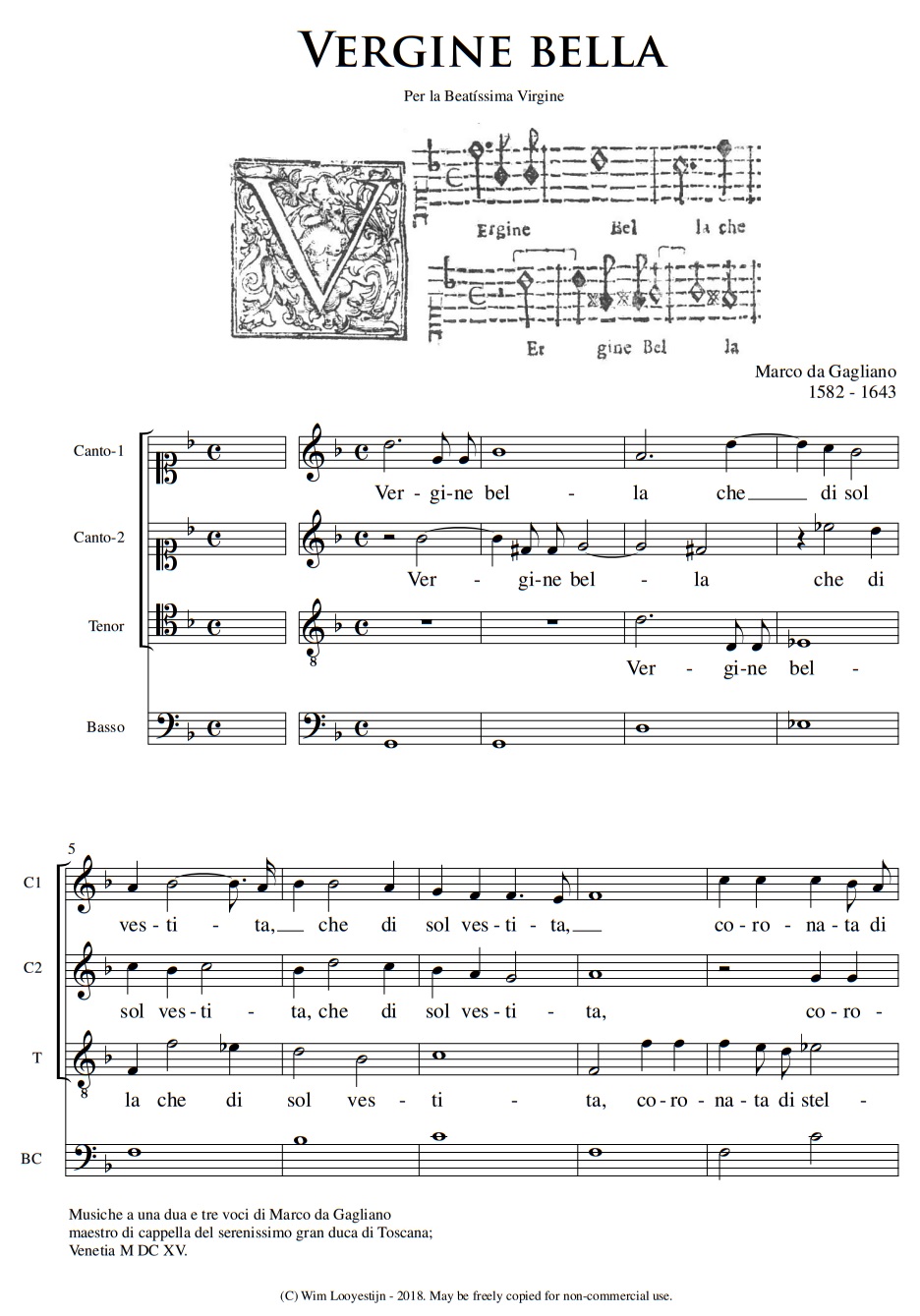 Marco da Gagliano (1º maggio 1582 - 1643): Vergine bella, canzone spirituale a 3 voci e basso continuo (pubblicata in Musiche a una dua e tre voci, 1615, n. 21) su testo di Francesco Petrarca (Canzoniere 366, 1ª strofe). Ensemble La Fenice, dir. Jean Tubéry.