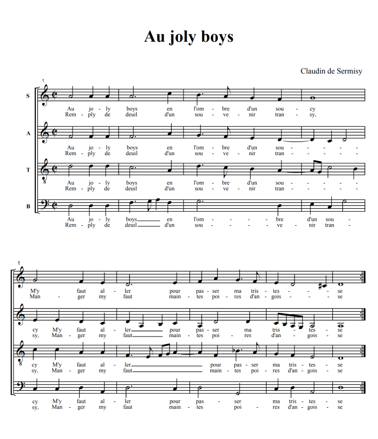 Questa delicata chanson si apre con un andamento lento e solenne, quasi meditativo: le quattro voci entrano in uno stile omoritmico, ovvero cantando le stesse parole simultaneamente con il medesimo ritmo. Questo conferisce alla domanda iniziale, «Qu’est-ce d’amour?», un peso e una gravitas particolari. La musica qui è prevalentemente accordale, con armonie chiare e consonanti che creano un’atmosfera di serena riflessione, quasi sacrale, che contrasta con il tormento interrogativo del testo.
