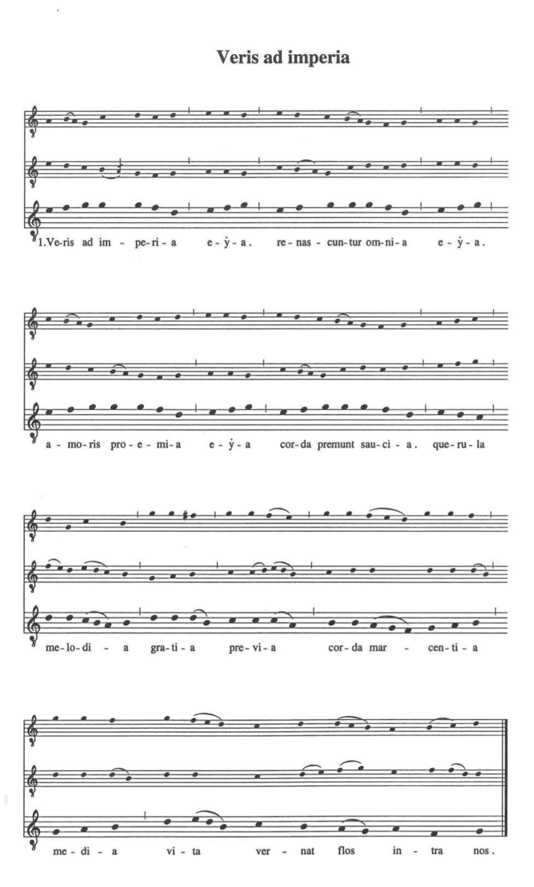 Se A l’entrada del temps clar è famosa, non altrettanto noto è che la sua melodia fu utilizzata da un anonimo esponente della cosiddetta Scuola di Notre-Dame come base per la composizione di un conductus a 3 voci. Il brano in questione s’intitola Veris ad imperia e ci è pervenuto tramite un altro importante manoscritto duecentesco, detto Antiphonarium mediceum in quanto conservato presso la Biblioteca Medicea Laurenziana di Firenze, ma redatto a Parigi e interamente dedicato al repertorio della celebre scuola polifonica che fiorì nella capitale francese. Nell’ambito di tale repertorio, Veris ad imperia è uno dei non molti componimenti che adottano come tenor un canto non liturgico; si tratta anzi a tutti gli effetti di una composizione profana che parla di amori terreni e non spirituali, quelli che sbocciano in primavera e feriscono i cuori.