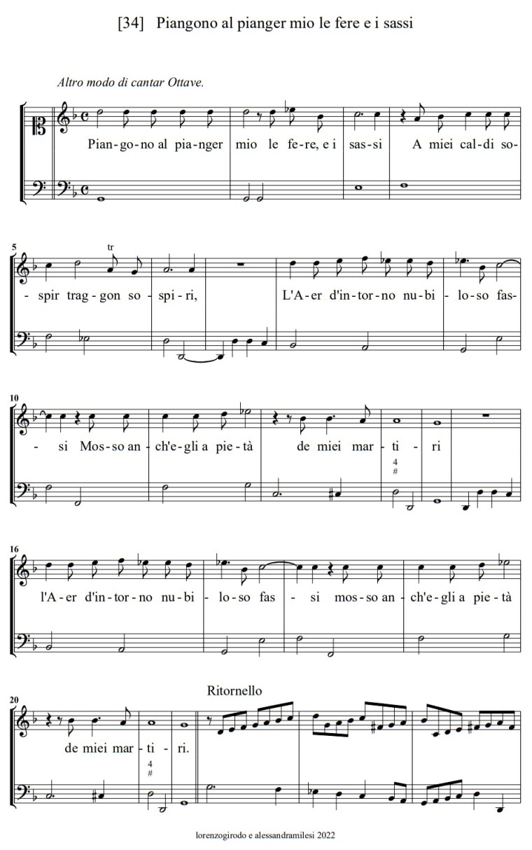 Vincenzo Calestani (10 marzo 1589 - p1617): Piangono al pianger mio, madrigale a 1 voce e basso continuo (pubblicato in Madrigali et arie per sonare et cantare nel chitarrone leuto o clavicimbalo a una, e due voci, 1617, n. 34); testo di Ottavio Rinuccini. Ensemble La Primavera.